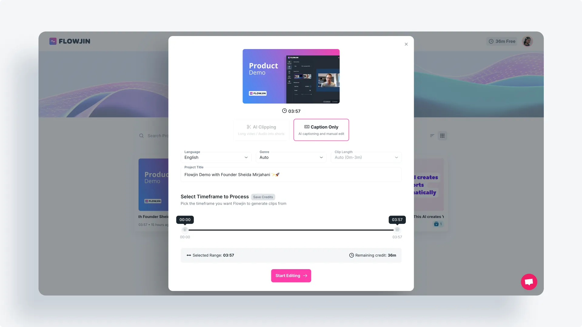 - Next, select “caption only” to add captions to your clip. Then choose which part of the video you want Flowjin to create clips with